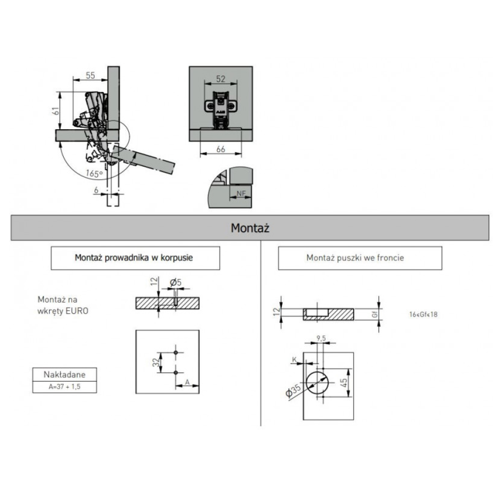 Панта GTV Ø35 мм +165 градуса покрит кант. Плавно затваряне с клипс. 3D реглаж. Подложка H=0.