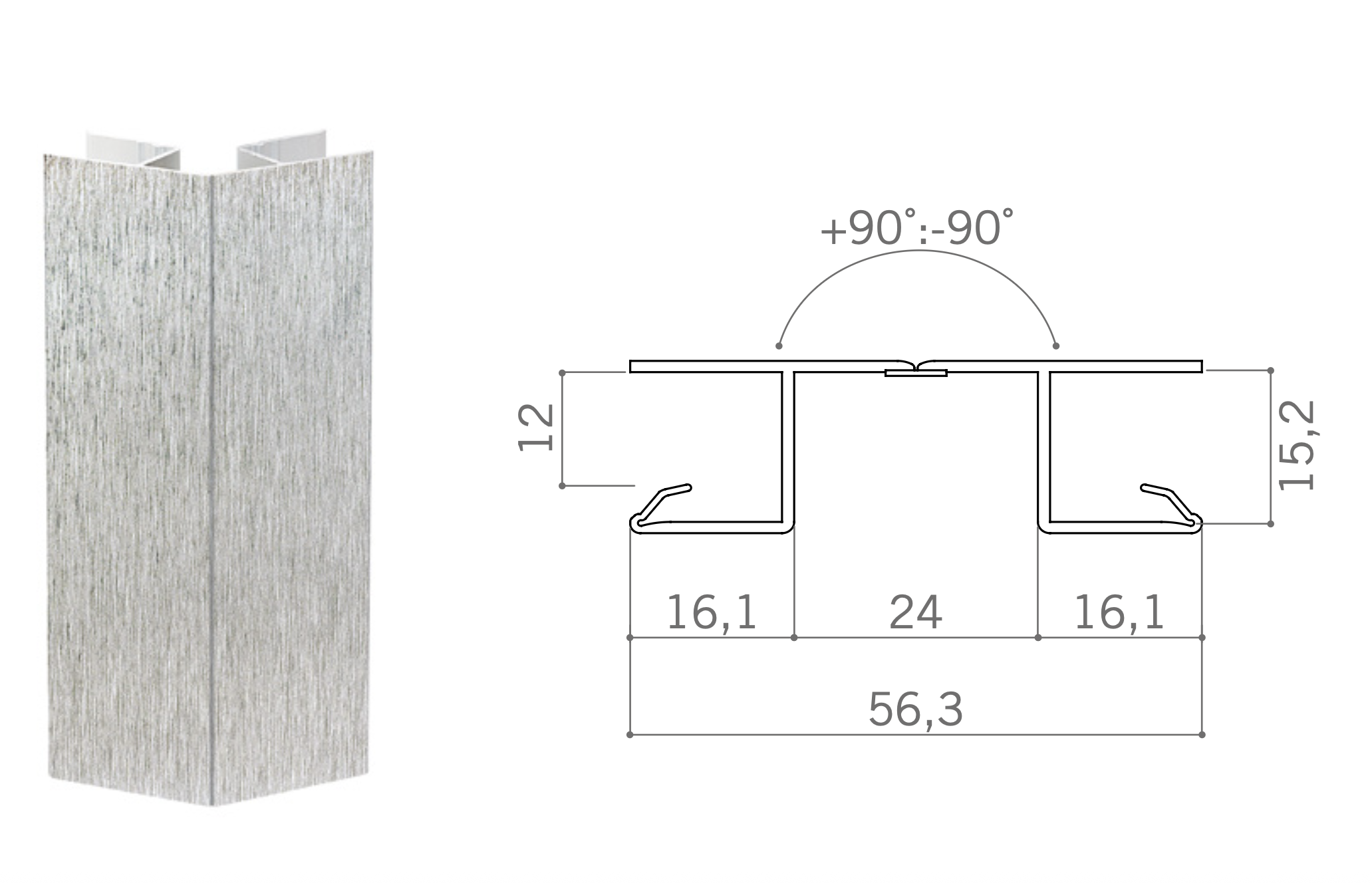 ПВЦ ъгъл на 90 градуса. Цвят инокс. Предлага се в две височини: 10 см и 15 см. Става като вътрешен и външен ъгъл. За ПВЦ цокъл.