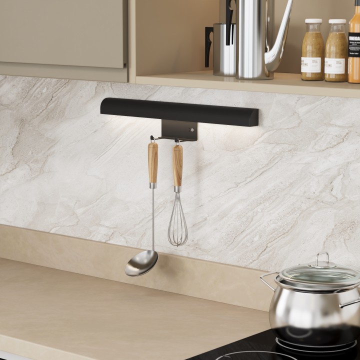 Закачалка с 5 куки подходяща за всяка кухня. Лесен монтаж за стената, на която може да окачите най- необходимите кухненски принадлежности.